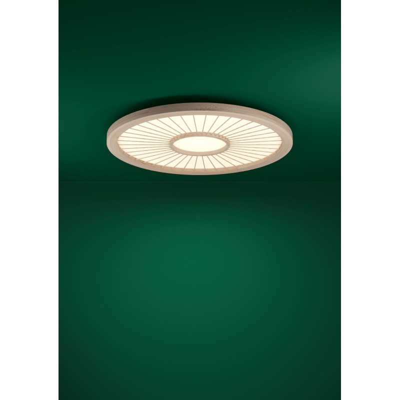 Stylowa oprawa sufitowa LED DEHESA w trendzie natury. Biała podstawa z bambusową osłoną w kształcie słońca doskonale uzupełni każde wnętrze.
