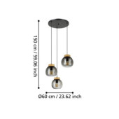 Lampa wisząca MAGACELA z trzema przydymionymi, szklanymi kloszami połączonymi z drewnianym elementem, który podkreśla jej wyjątkowy urok.