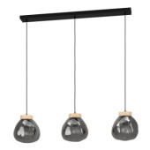Druga wersja lampy MAGACELA z trzema przydymionymi kloszami i drewnianymi akcentami, idealna do wnętrz o nowoczesnym charakterze.
