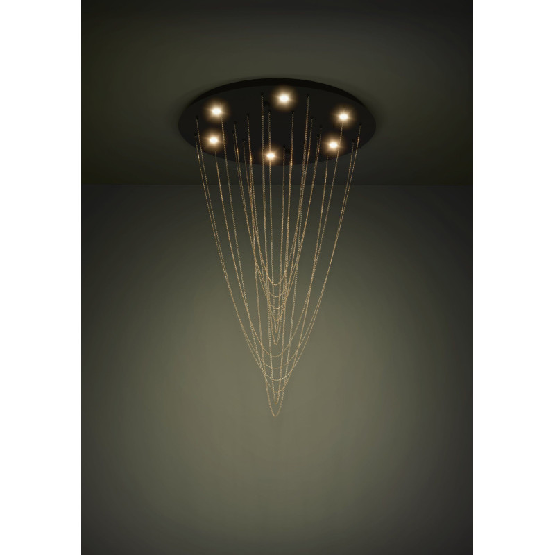 Efektowna lampa sufitowa LED TREPUCO z czarnym metalowym daszkiem i złotymi łańcuszkami, tworząca lśniący i elegancki efekt.