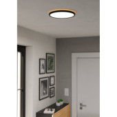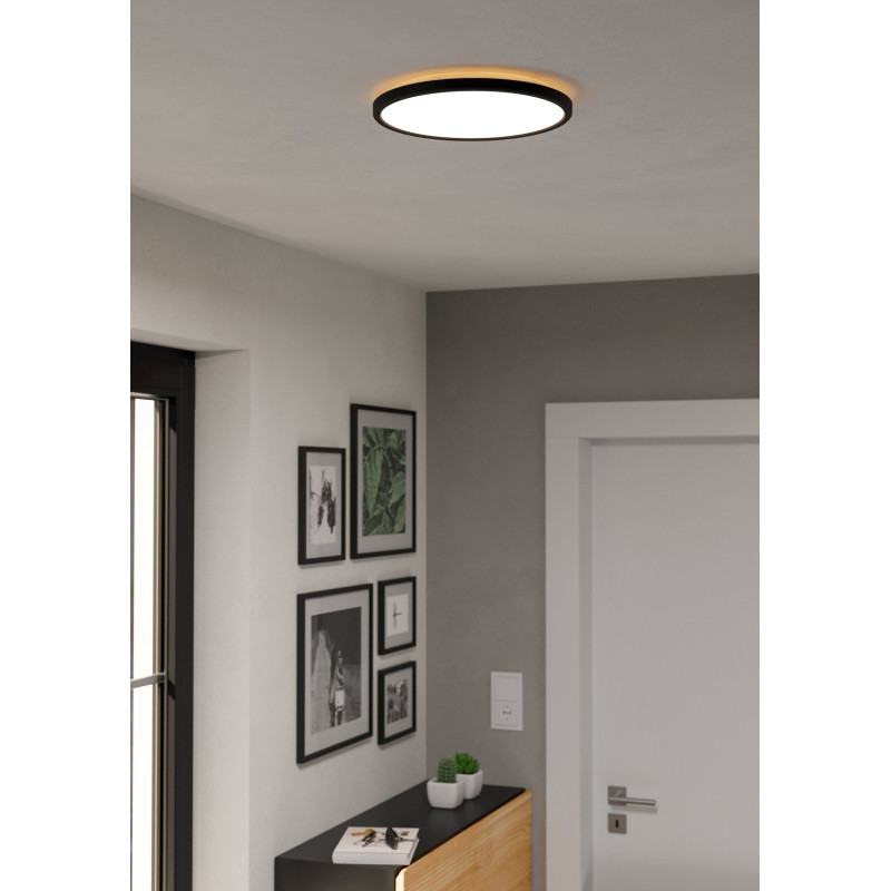 Czarny plafon LED ROVITO o średnicy 30 cm, idealny dla wnętrz wymagających prostoty i elegancji. Jego niewielki rozmiar i możliwość dostosowania barwy światła czyni go doskonałym wyborem dla małych łazienek, przedpokojów czy kuchni.
