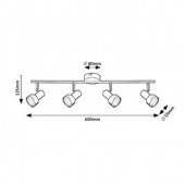 Lampa z kategorii: Lampy wewnętrzne. Typ lampy: Oświetlenie punktowe. Lampa w stylu: Industrialne. Sugerowane pomieszczenie: pokój dzienny, pokój do pracy. Stopień ochrony IP: IP20. Lampa w kolorze: czarny matowy. Kolor klosza: srebrny. Materiał z jakiego wykonana jest lampa: metal. Materiał z jakiego wykonano klosz: metal. Czy źródło światła jest w zestawie? nie. Liczba gniazd: 4 szt. Typ gniazda: GU10. Zastosowane napięcie: 230V, 50Hz. Specyfikacja oprawy oświetleniowej: GU10 4x MAX 50. Odległość od sufitu: 125.0. Wymiar poziomo: 600.0 mm. Wymiar pionowo: 55.0 mm. Średnica: 55.0 mm. Waga lampy (netto): 0.66 kg. Rozmiar otworu montażowego: 80.0mm. Klasa ochronności: I. Utrzymana w stylu industrialnym oprawa punktowa Konrad z czterema punktami świetlnymi jest polecana przede wszystkim do salonu lub sypialni. Wykonana w całości z metalu oprawa w kolorze matowej czerni jest uzupełniona srebrnymi kloszami i może być przymocowana do sufitu za pomocą małej, okrągłej podstawy. Ruchome głowice ułożone są w jednym rzędzie na długim pręcie przymocowanym do podstawy dekoracyjnej, co pozwala na skierowanie światła w dowolny sposób według upodobań. Do oprawy Konrad można zastosować cztery źródła światła z trzonkiem GU10 o mocy max. 50 W każda. Jeżei oprawa sufitowa zostanie zamontowana w sypialni, zaleca się stosowanie ciepłobiałych źródeł światła, które pomogą stworzyć przytulną, domową atmosferę. Wymiary oprawy Konrad z czterema punktami świetlnymi są następujące: szerokość 600 mm, wysokość 120 mm, średnica kloszy 55 mm, odległość oprawy od sufitu 125 mm, średnica otworu montażowego 80 mm. Produkt ten jest dostarczany bez źródła światła.Typ: Oświetlenie punktowe. Styl kategorii lamp: Industrialne. Proponowane pomieszczenie: pokój dzienny. Proponowane pomieszczenie: pokój do pracy. Stopień ochrony IP20. Brak czujnika ruchu. Kolor lampy: czarny matowy. Kolor klosza: srebrny. Materiał lampy: metal. Materiał klosza: metal. Brak źródła światła w zestawie. Liczba gniazd: 4. Typ gniazda: GU10. Napięcie: 230V. Specyfikacja oprawy oświetleniowej: GU10 4x MAX 50. Odległość od sufitu: 125.0mm. Wymiar (poziomo): 600.0mm. Wymiar (pionowo): 120.0mm. Średnica: 55.0mm. Rozmiar otworu montażowego: 80.0mm. Klasa ochronności: I.
