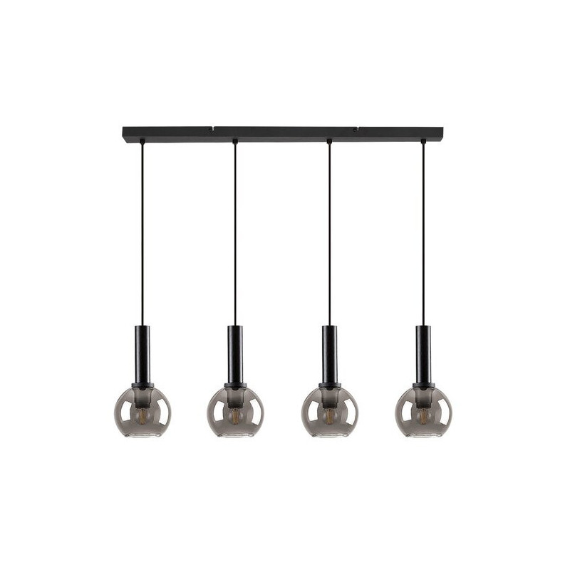 Typ lampy to Lampy wiszące. Styl lampy to Nowoczesne. Lampa przeznaczona do pomieszczenia: pokój dzienny. Kolor lampy to Czarny. Kolor klosza to Szkło Dymne. Materiał lampy to Metal. Materiał klosza to Szkło. Typ gniazda to E27. Napięcie lampy to 230V. Specyfikacja oprawy oświetleniowej: E27 4x MAX 40. Odległość od sufitu wynosi 1200.0mm. Wymiar (poziomo) wynosi 780.0mm. Średnica wynosi 150.0mm.