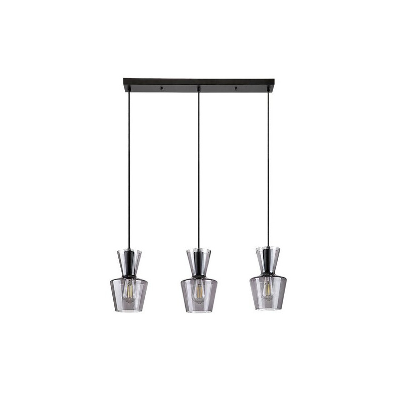 Typ lampy to Lampy wiszące. Styl lampy to Nowoczesne. Lampa przeznaczona do pomieszczenia: pokój dzienny. Kolor lampy to Czarny Matowy. Kolor klosza to Szkło Dymne. Materiał lampy to Metal. Materiał klosza to Szkło. Typ gniazda to E27. Napięcie lampy to 230V. Specyfikacja oprawy oświetleniowej: E27 3x MAX 60. Odległość od sufitu wynosi 1700.0mm. Wymiar (poziomo) wynosi 600.0mm. Wymiar (pionowo) wynosi 250.0mm. Średnica wynosi 150.0mm.