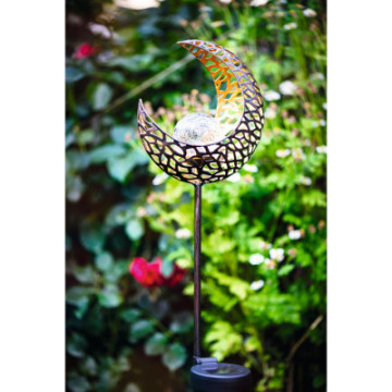 Elegancka lampa solarna z kloszem wykonanym z przezroczystego szkła mozaikowego. Połączenie czarno-złotej obudowy i LED zapewnia nastrojowe oświetlenie.