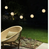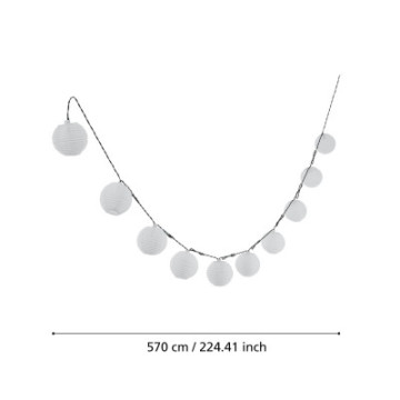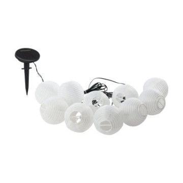 Stylowa girlanda solarna z abażurkami z papieru ryżowego w kształcie białych kulek, które zapewniają delikatne, ciepłe światło.